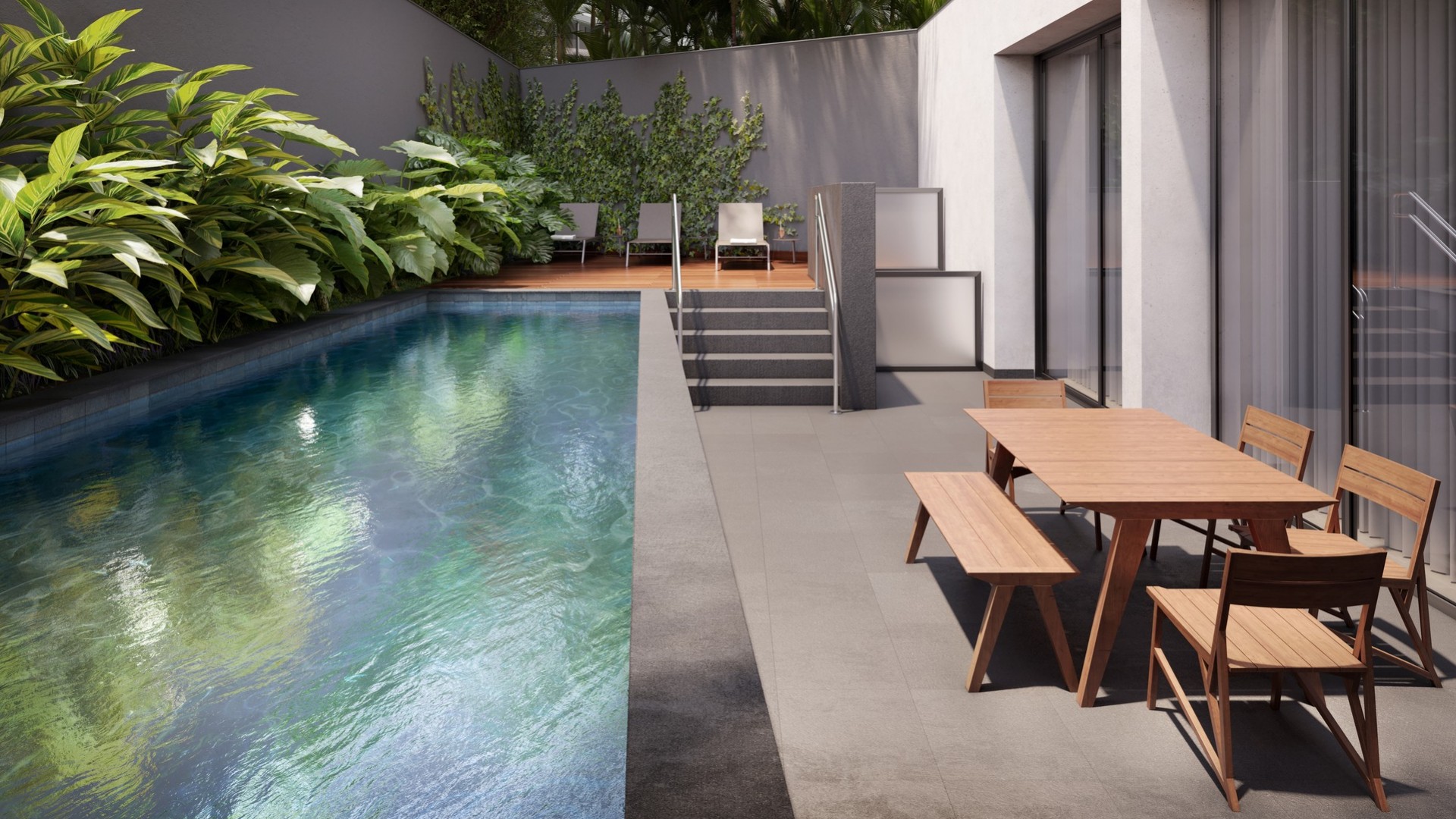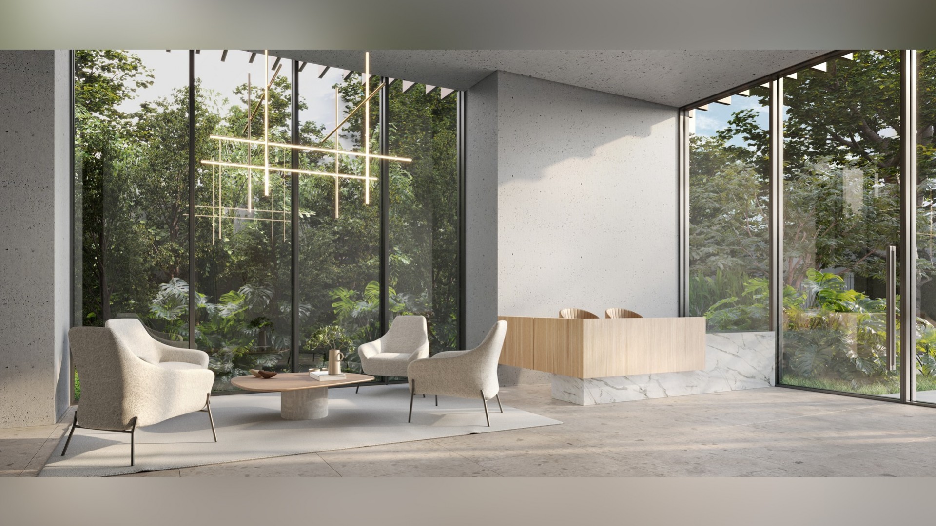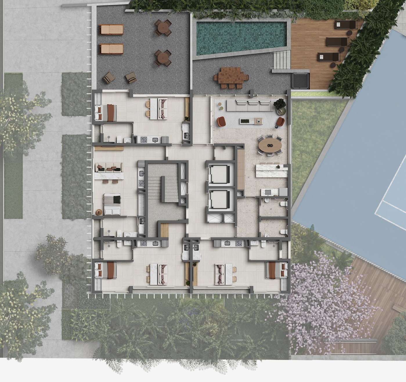 A composição arquitetônica é destacada pelas varandas que percorrem toda a extensão das residências e dão unidade à torre pelo respiro visual. Os apartamentos se abrem para uma vegetação exuberante. Nas áreas de convívio, um paisagismo autoral pontua os espaços com espécies naturais. A ventilação e luminosidade naturais nos ambientes são garantidas pelas amplas esquadrias do piso ao teto.