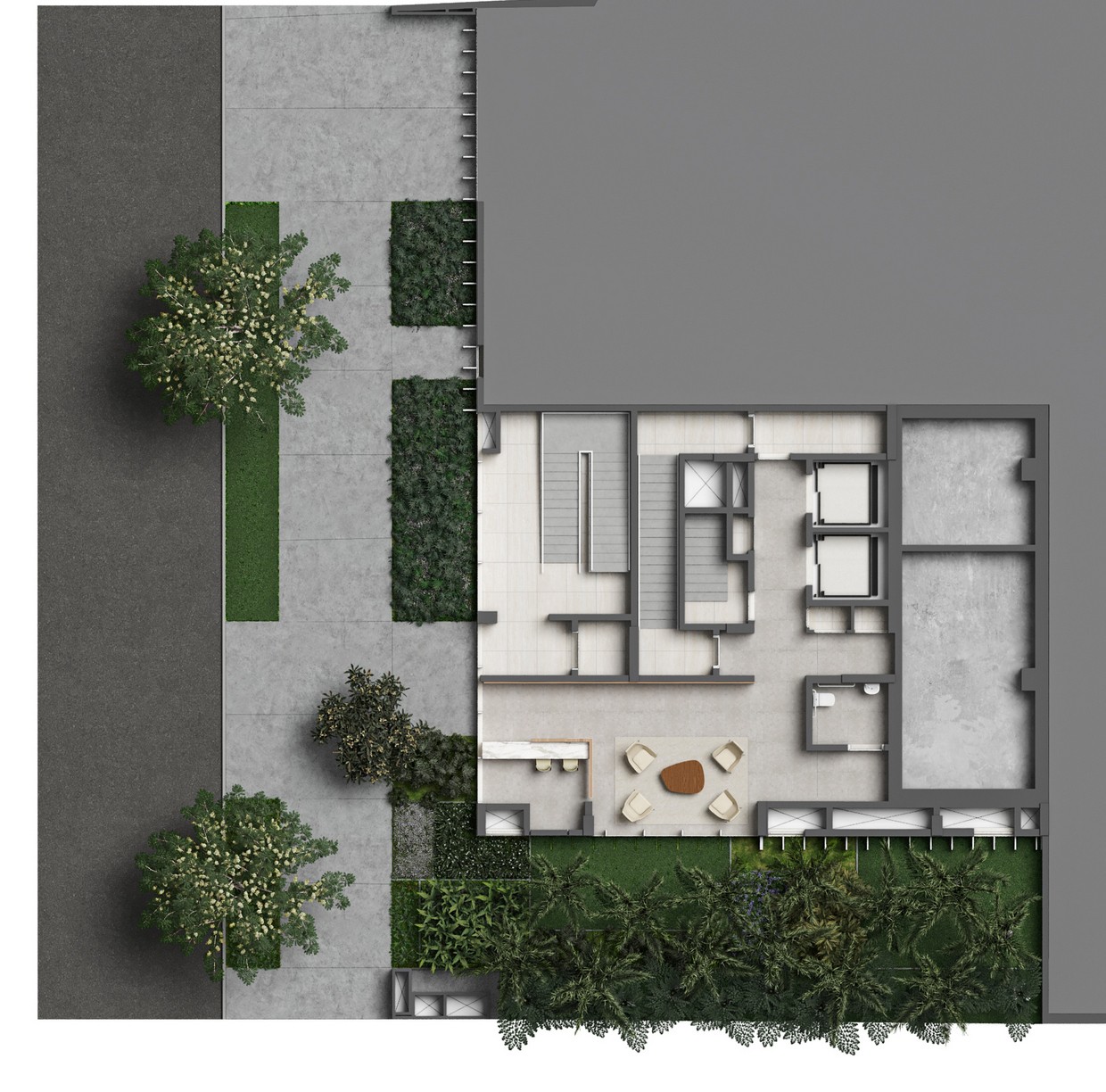 Compreender as potencialidades dos espaços externos advindos da implantação das torre residenciais, configurando um grande pátio central, eis a chave da questão para a elaboração do Projeto de Paisagismo do empreendimento Monã. Exploramos assim as melhores relações espaciais entre dentro e fora, luz e sombra e entre fluxos e perspectivas de modo a criarmos belos e confortáveis lugares de estar, relaxar, jogar, brincar e conviver.